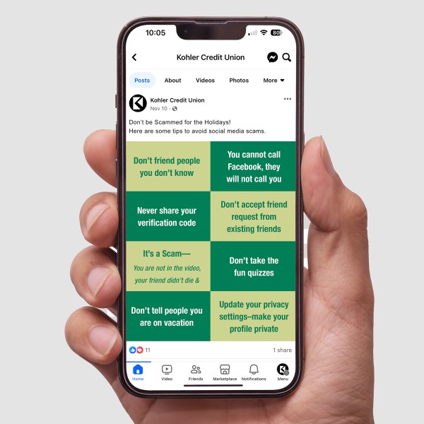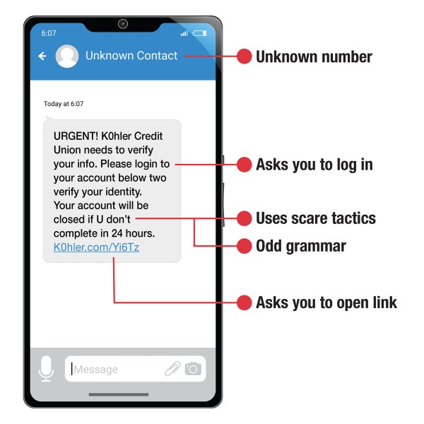 Be leery of unsolicited calls, particularly those that pressure you to make quick decisions or demand secrecy. Legitimate organizations generally do not ask for immediate action or sensitive information over the phone if they initiated the call. Kohler Credit Union has security procedures in place to verify member identity when you call us directly. Government agencies such as the IRS will make first contact by direct mail. Pay attention to the caller’s tone; scammers often use aggressive tactics or create a sense of fear to manipulate you. Calls from unfamiliar or blocked numbers, payment requests through gift cards, wire transfers or Bitcoin are usually scams. Verify the caller’s identity by asking for official contact information and confirming details independently. Trust your instincts; if something feels off, it probably is. Consider using a call-blocking app to filter potential scam calls.