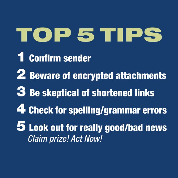 Start by checking the sender’s email address; legitimate organizations use official domain names, so be cautious if it appears unusual or contains misspellings. Pay attention to the email’s tone and grammar; scammers often use urgency, fear, or overly formal language to exploit recipients. Be careful with unexpected attachments as they may contain malware. Never send personal or financial information in an email and keep your anti-virus software and operating system up to date.